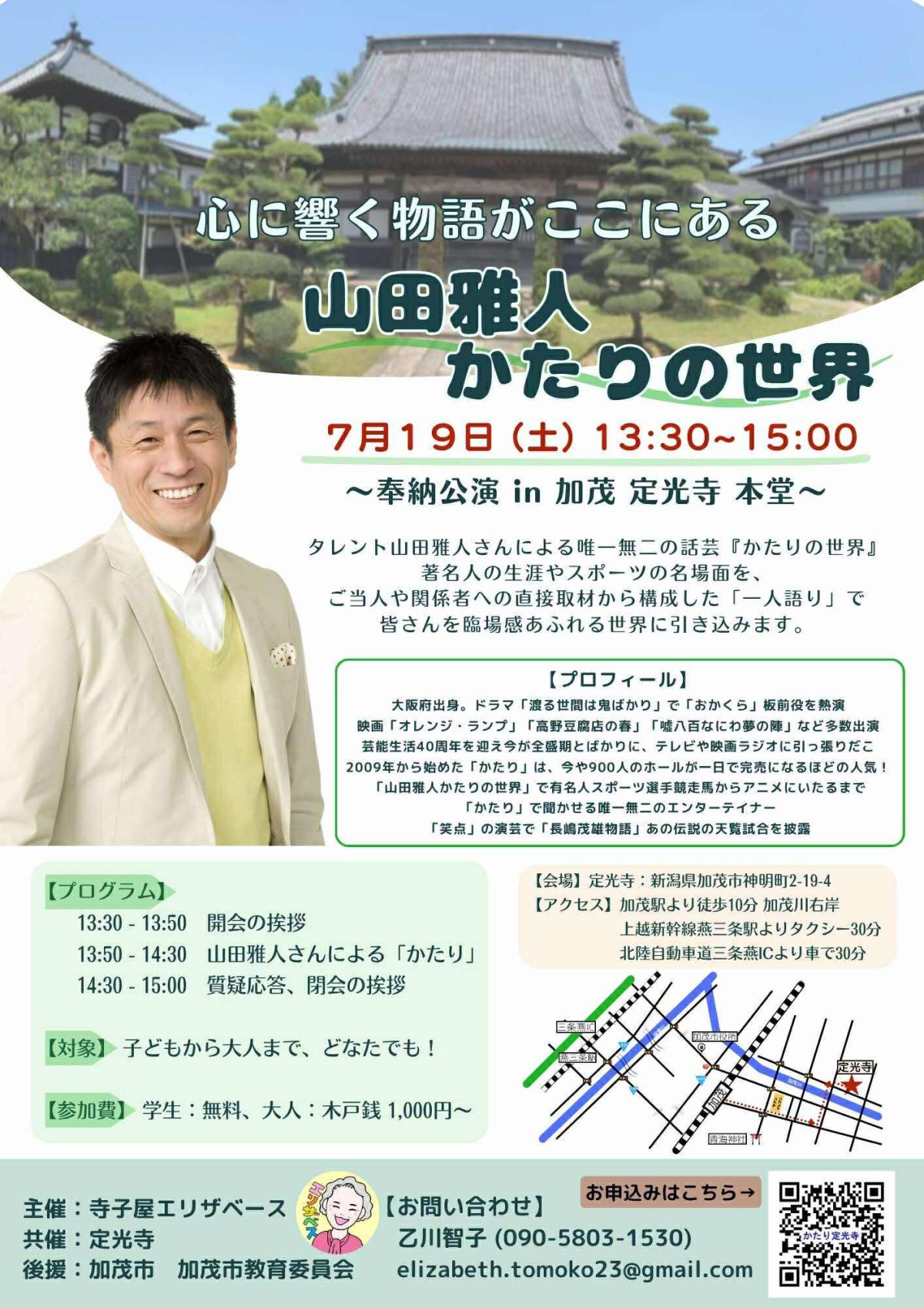 心に響く物語がここにある~ in 加茂 定光寺~山田雅人「かたりの世界」 タレント山田雅人による、唯一無二の話芸「かたりの世界」有名人の生涯やスポーツの名場面をひとり語りで、臨場感あふれる世界に引き込みます。 チケットはこちら 画像クリックで拡大します 開催日時 開演日:2025年07月19日(土) 開場:13:00 開演:13:30 終演:15:00 開催場所・会場 定光寺 チケット発売 販売中 チケット:参加費 学生:無料/ 大人:木戸銭¥1,000-から (料金当日)